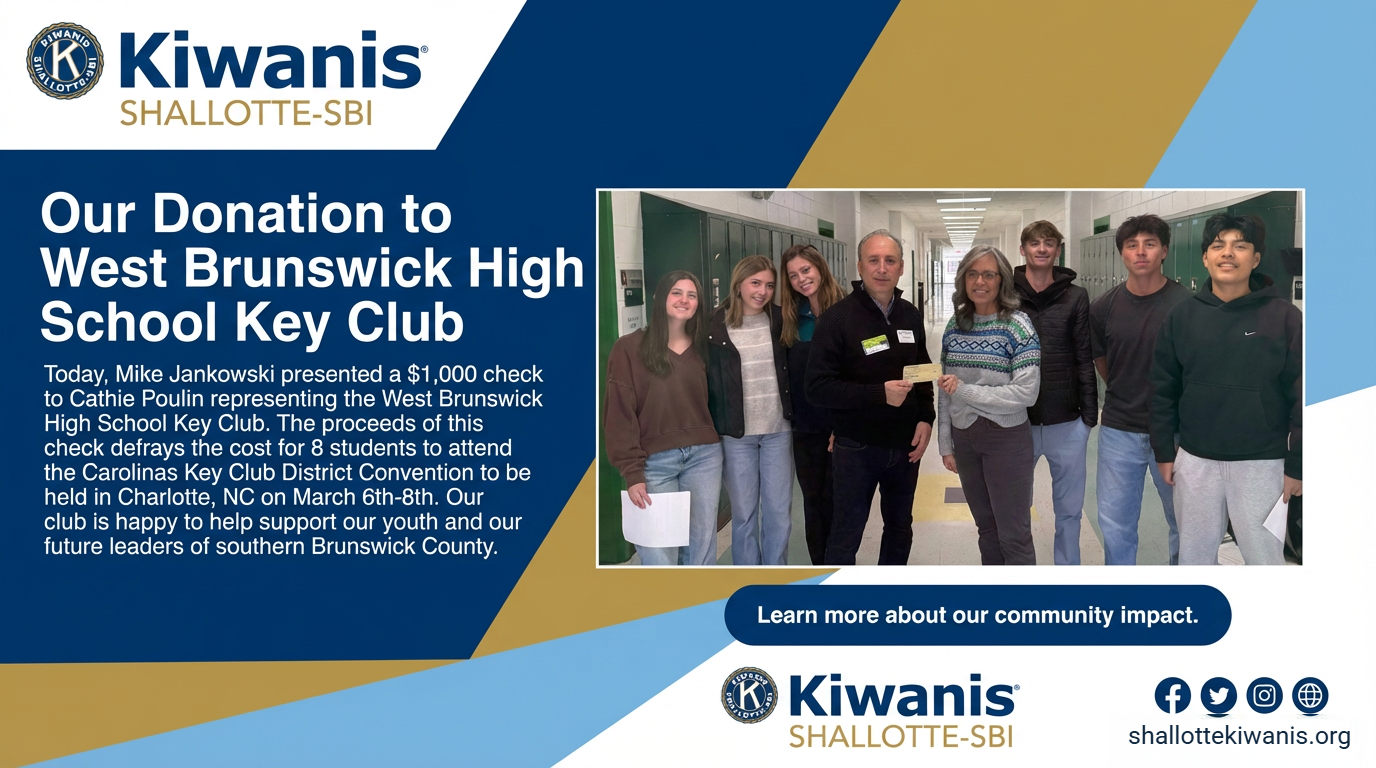 Today, Mike Jankowski presented a $1,000 check to Cathie Poulin representing the West Brunswick High School Key Club. The proceeds of this check defrays the cost for 8 students to attend the Carolinas Key Club District Convention to be held in Charlotte, NC on March 6th-8th.